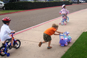 My son has absolutely no interest in bikes or scooters and although all the kids his age are on bikes with training wheels he can't even pedal or steer ( or I should say does not try). So in 2 seconds he deserted his bike and they switched.