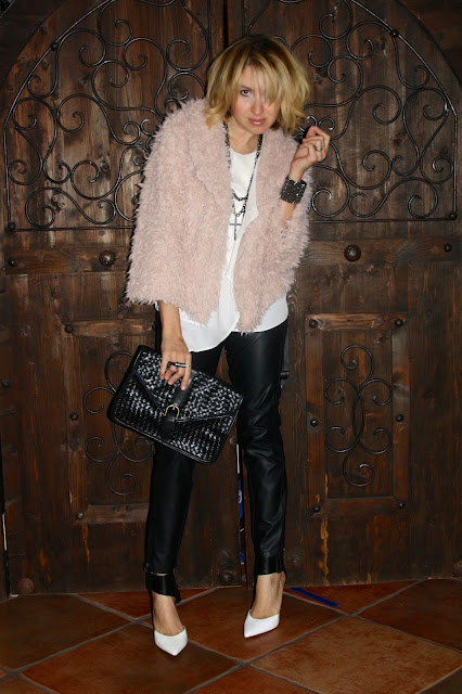 The concept was the same: leather pants harem stye or skinny topped with a white top and the shaggy blush pink coat and a clutch and heels.