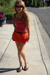 Not that I was super crazy about it but since I had items in both of these colors thought it would be a cool experiment to pair them. I think it would have been better if I had a brown cardigan instead to anchor these colors. This thin faded gold shrug is another super old item, so is the dusty pink camisole. The orange shorts were a F21 purchase 3.5 years ago. I seem to always find different ways to wear them every summer. The outfit would have looked killer with my mom's thick strappy brown sandals I wore all summer in Turkey but without access to them and with kids these suede ballet flats will have to do. Wore a very subtle goold necklace but a bold burnished cuff bracelet. Oh, got to wear the gold and rhinestone anklet since finally I am wearing a non 'ankle cuff' shoe.