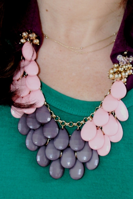 I thought it was interesting to pair purple with green among navy. She did a touch of mint green but I didn't have such necklace so I went with my pink and mauve one which still worked I think.To pick up the pink from the necklace I added a pink trench instead of navy...